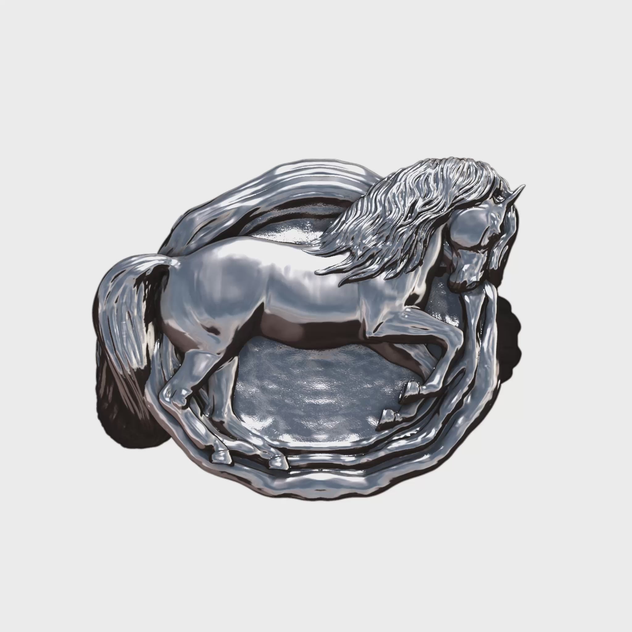 Experience equestrian art with an edge. This solid sterling silver ring is meticulously made to order, capturing the dynamic spirit of a horse in motion. A statement piece that is a timeless addition to any collection of fine jewelry. A bold and perfect present idea for horse lovers.